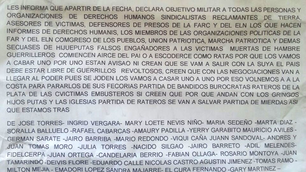 The report recalled that in Colombia, between September and October 2014, more than a hundred defenders of human rights, community leaders, leading promoters of peace and land restitution, politicians and journalists were subjected to death threats from paramilitary groups.