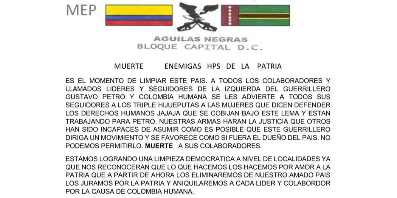 It is time to cleanse this country of all collaborators and so-called leftist leaders and supporters of guerrilla Gustavo Petro and Humane Colombia. We warn all his followers… [that] our arms will do justice that others have not been able to.