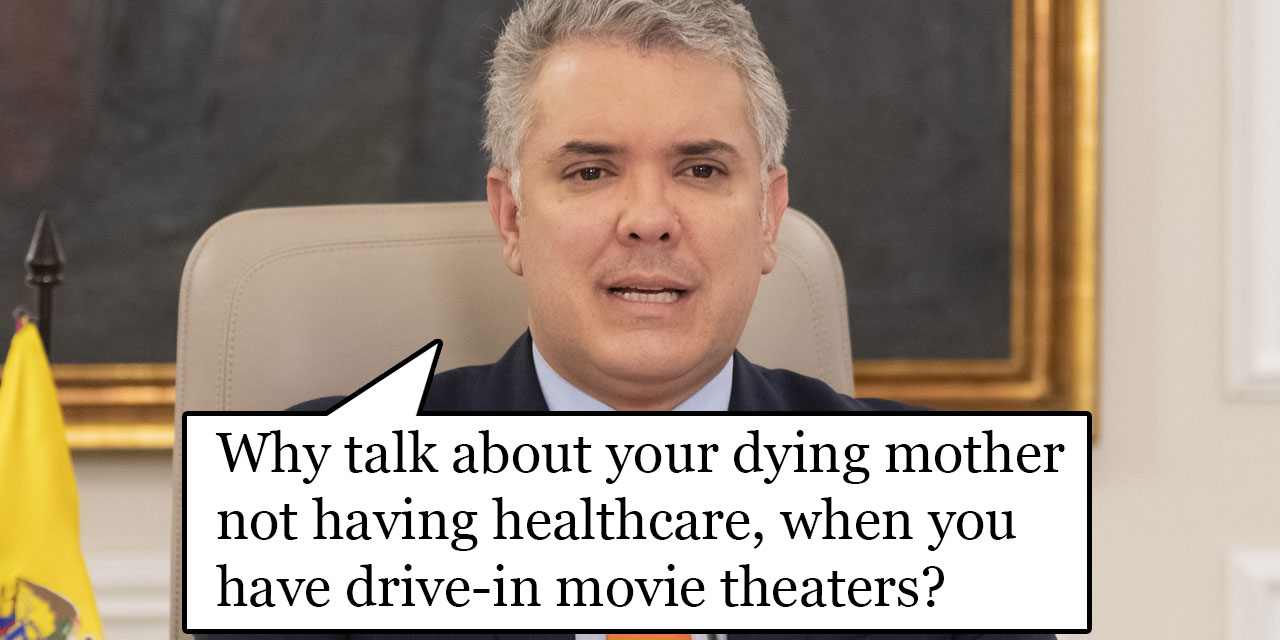 The president apparently wouldn’t let dying Colombians ruin his announcement that he had authorized the opening of drive-in theaters in the lock-down that will be in place until August 31.