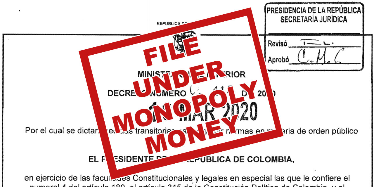 Duque’s decree was only signed by himself, Defense Minister Carlos Holmes Trujillo and Interior Minister Alicia Arango, giving it the legal validity of monopoly money.
