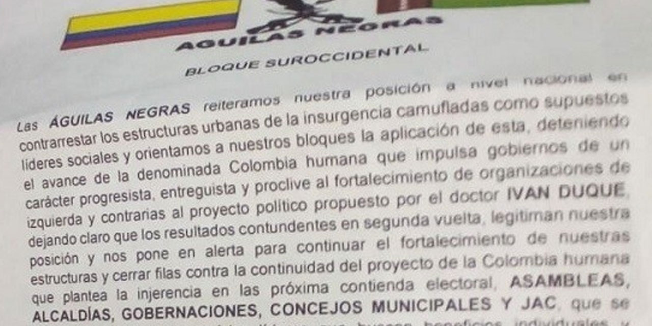 The Aguilas Negras reiterate our position to counter the urban insurgency structures camouflaged as supposed social leaders…, detaining the advance of what is called Humane Colombia that promotes governments of a progressive character, submitted and inclined to strengthening leftist organizations, and opposed to the political project proposed by Mr. Ivan Duque.