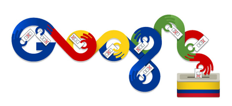 The doodle, live on the Colombian Google homepage since Sunday morning, features patriotic colors and a set of hands casting a vote into a ballot box and invites all Colombian citizens to exercise what President Juan Manuel Santos called their “right and duty” to vote.