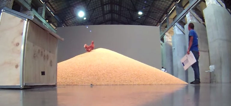 The chicken’s feeding binge / act of vandalism was filmed by the young artist himself in March as part of a university project in which he wanted to question the definition of art.