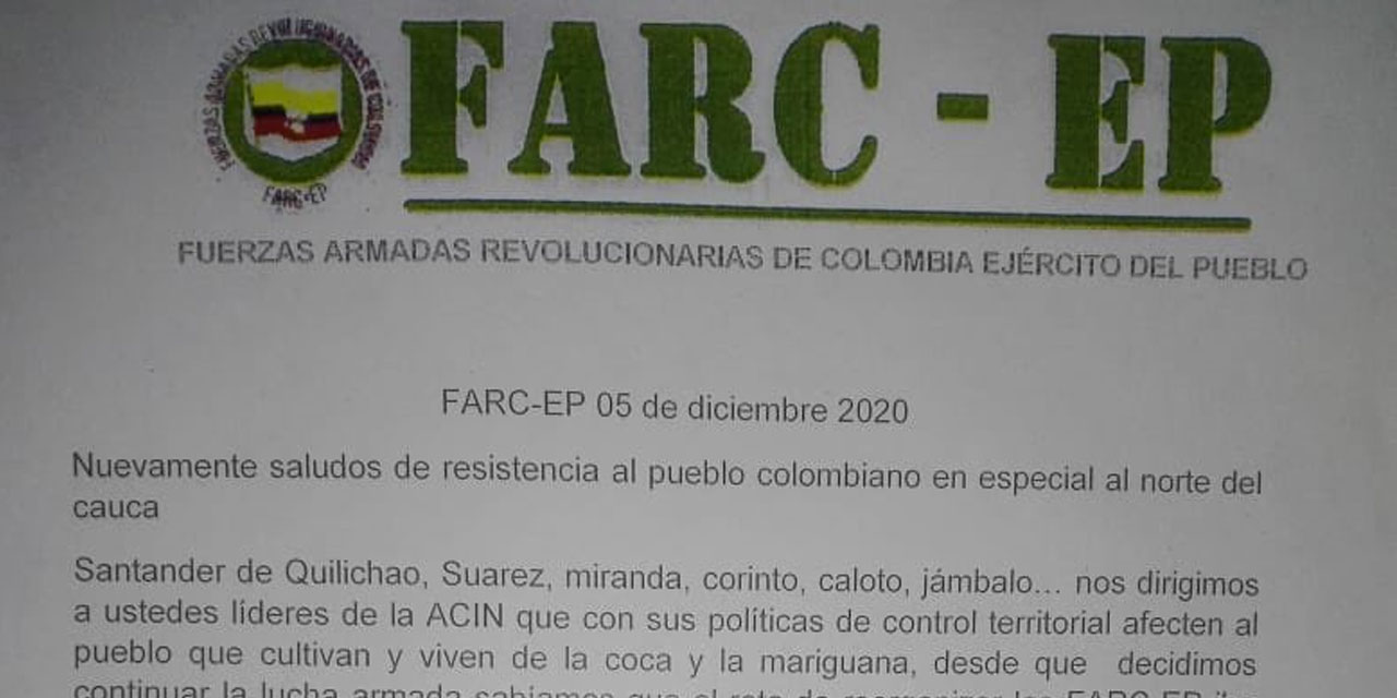 The death threat signed by a dissident FARC group was sent to the Indigenous Elders from Northern Cauca (ACIN) after armed men on Saturday evening indiscriminately opened fire at people in several places in the war-torn region.